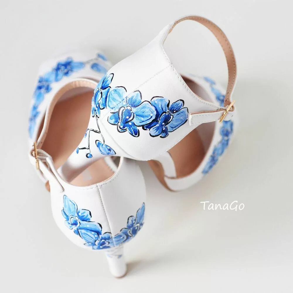 Modrá orchidej - pokud jste její milovníci, mějte ji i na svatebních lodičkách. Jsou jemně pomalované tímto vzorem. V srdíčkách na patě vnitřní stélky jsou vepsány iniciály a datum svatby.