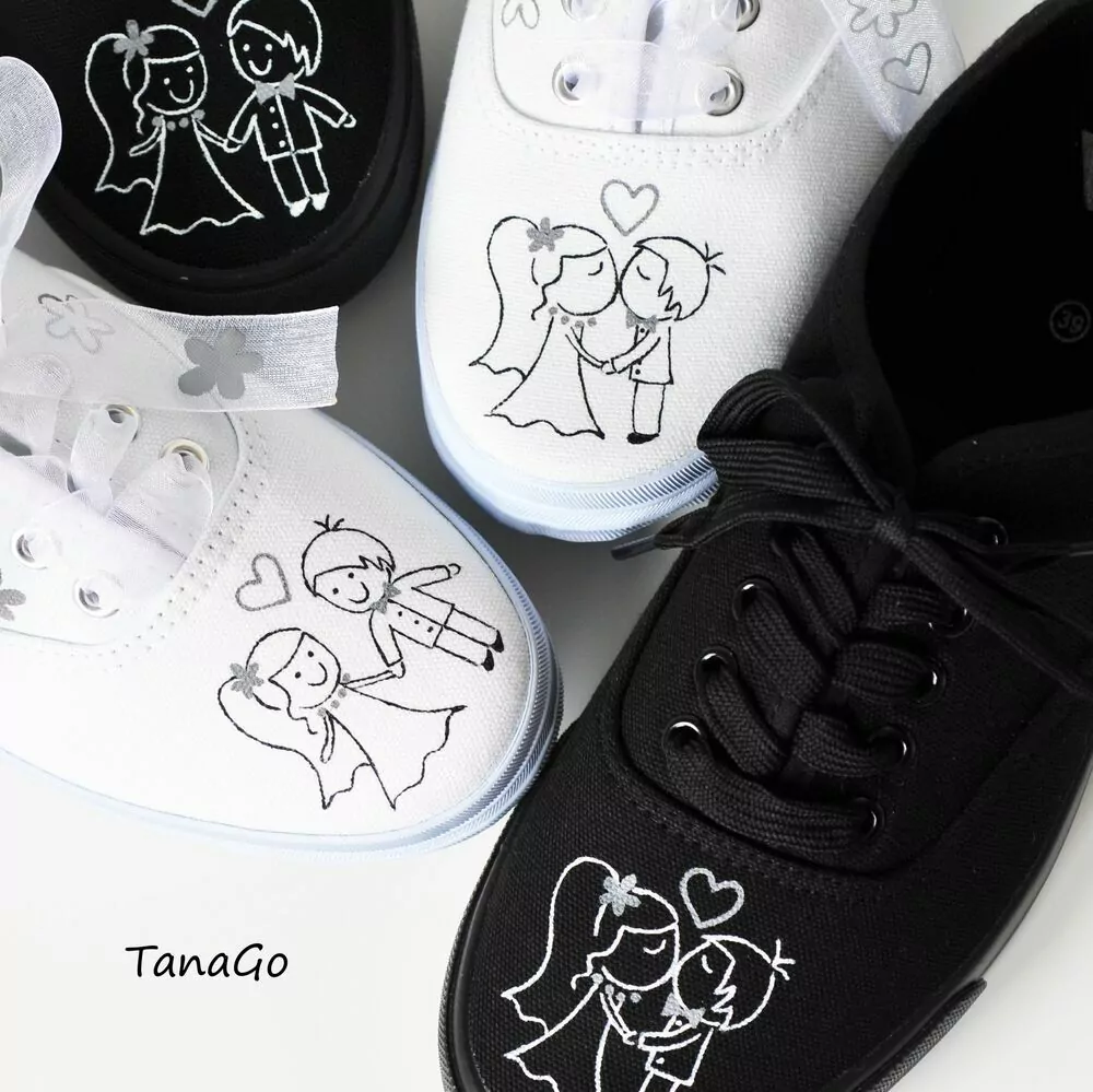 Párové tenisky s postavičkami - základ dívčích je bílý a mužských černý. Kresba je černou a bílou, na doplňcích postaviček a květinkách - pro tentokrát neutrální šedá (můžete si zvolit podle barvy svatby).