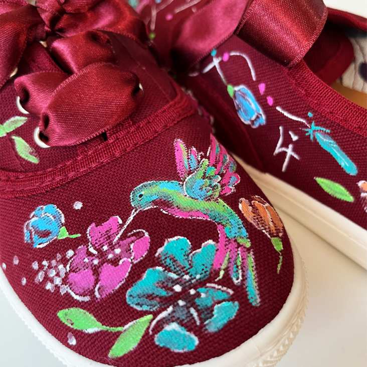 Víš, že se tvé nitro může odrážet na tvých teniskách? Máš-li své symboly, já je zpracuji do takovýchto maleb. Li si přála kolibříka, lapač snů, vážku, lebku a další znaky. Na teniskách je to propojeno v sourodý celek.