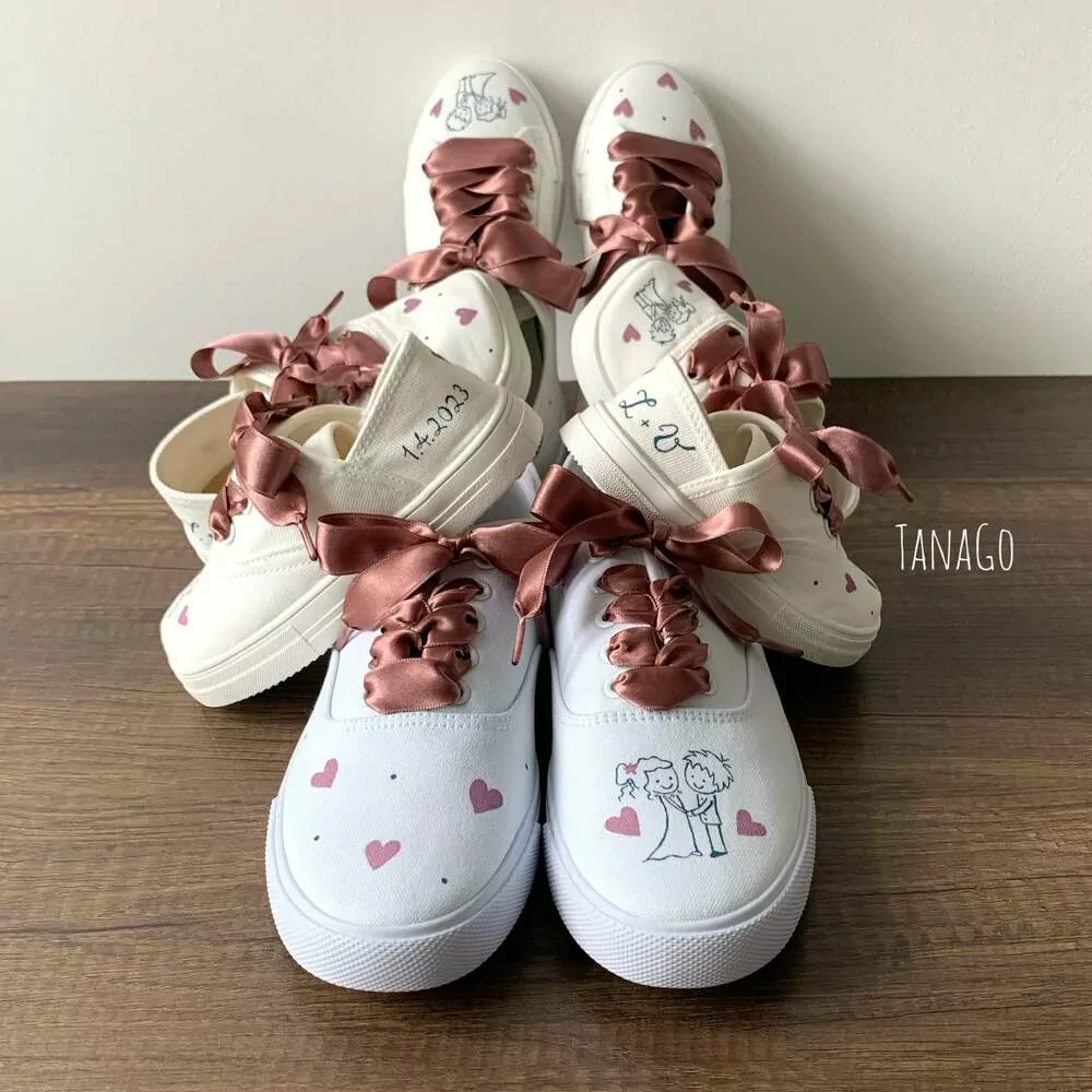 Všechny tenisky mi nevěsta poslala k pomalování, já vám tento vzor namaluji na mnou dodávané tenisky vyrobené v Evropě, které tady všude na e-shopu můžete vidět. Pokud budete chtít taky jen pomalovat poslané tenisky, budete platit za malbu nižší cenu podle jejího rozsahu - napište mi o tom.