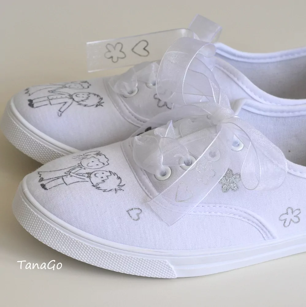 Udělejte svůj svatební den ještě jedinečnějším s těmito nápaditými malovanými teniskami! Jsou to originální boty s osobitým stylem a stanou se skvělou vzpomínkou na váš velký den. Je to ideální volba pro svatební hostinu, předsvatební focení, rozlučku se svobodou, líbánky i běžné nošení.